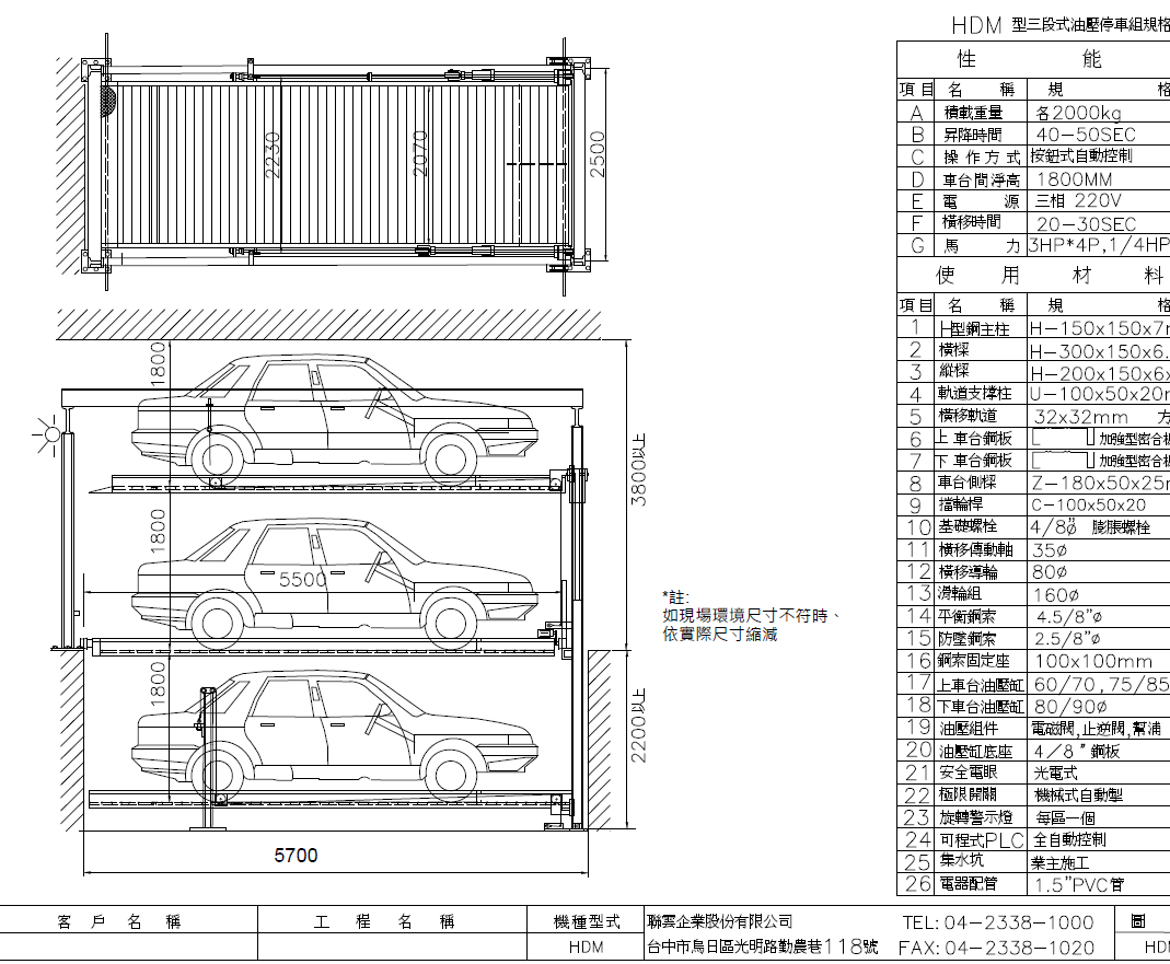 HDM型有機坑升降橫移式機械停車 產品特色 直接式油壓動力系統升降平穩不晃動,且下降時不耗電安靜無噪音。 上下車台連接為廂型結構,堅固安全。 客製化產品,可依客戶需求加寬加高得以停放休旅車。 車台前緣加裝平衡鋼索保持車台水平不變形。 簡易升降式,經濟實惠,故障率低且日後保養維修成本最低。 型錄下載 設備圖下載 空間規劃效率且外觀整潔有序